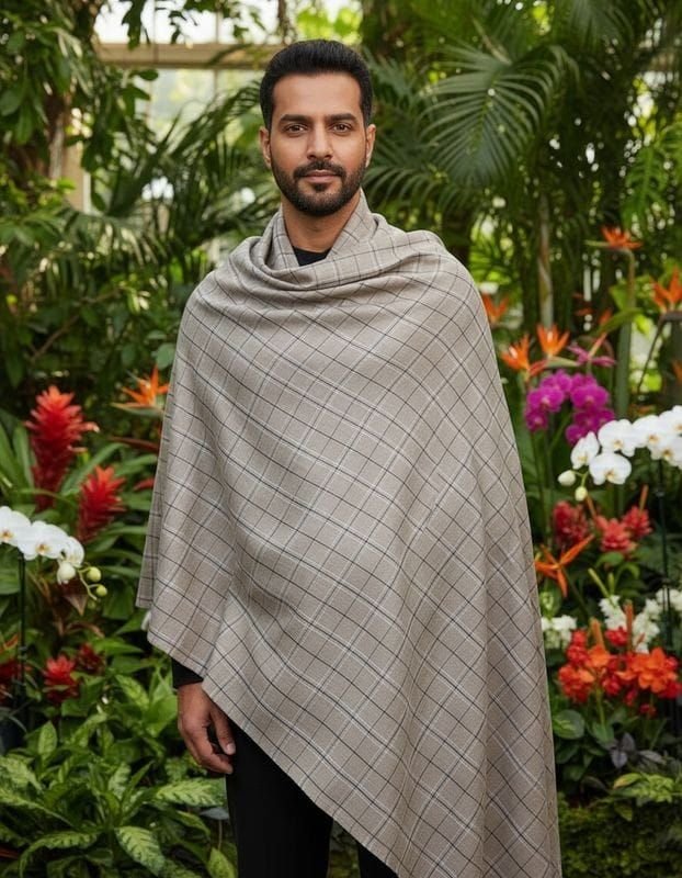 We offer a premium Mens Check Pattern Pashmina Shawl crafted from traditional Kashmiri weaving techniques. This classic shawl features a size of 50 X 100 inches, made from luxurious Pashmina wool in a soft and warm texture with a smooth finish. The design showcases a timeless check pattern with a base color of light brown and pattern colors of black. Ideal for winter wear, this shawl requires dry clean only for care. Each shawl is meticulously folded and packaged for a sophisticated presentation. Perfect for exporters, suppliers, and traders looking to offer high-quality winter accessories.